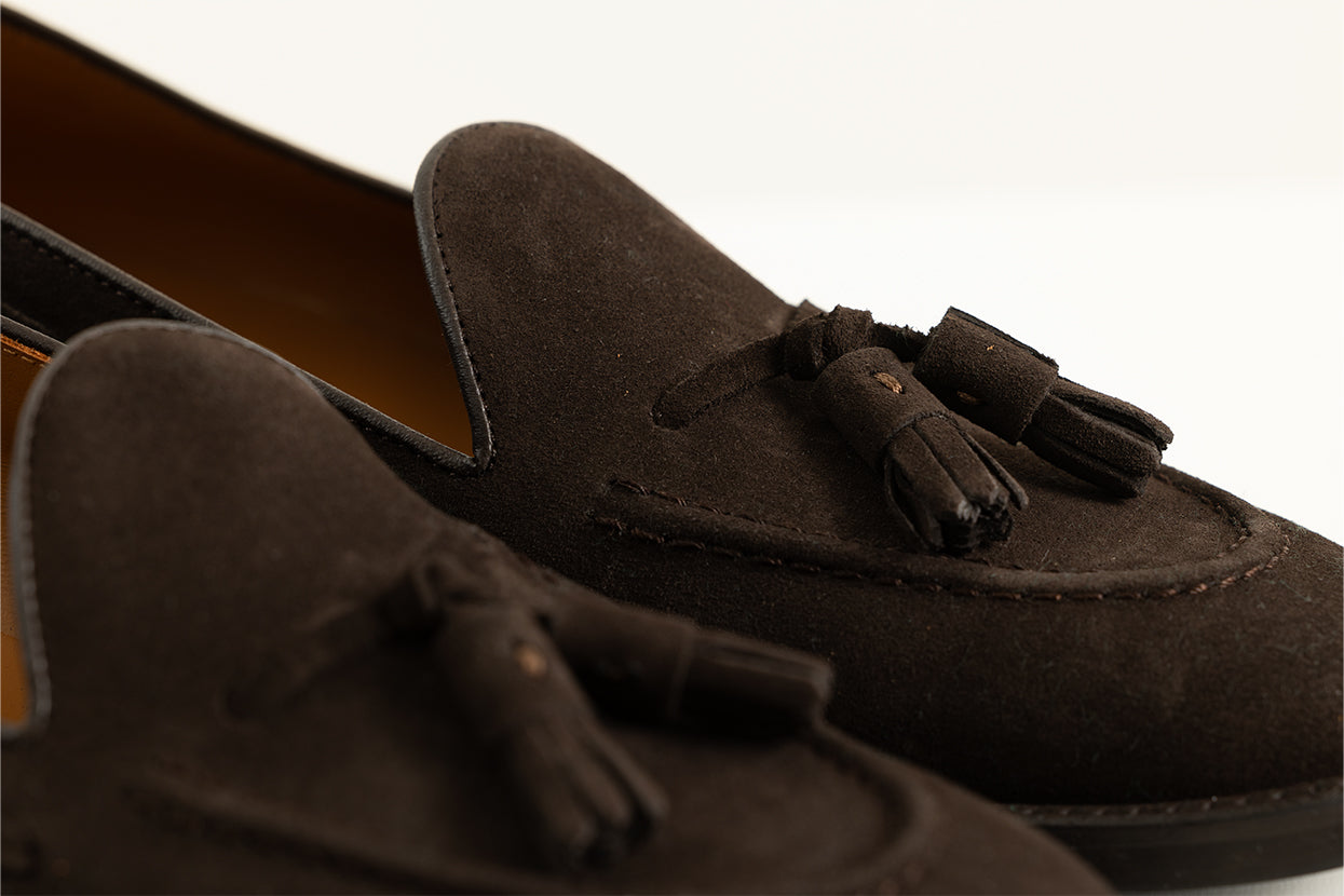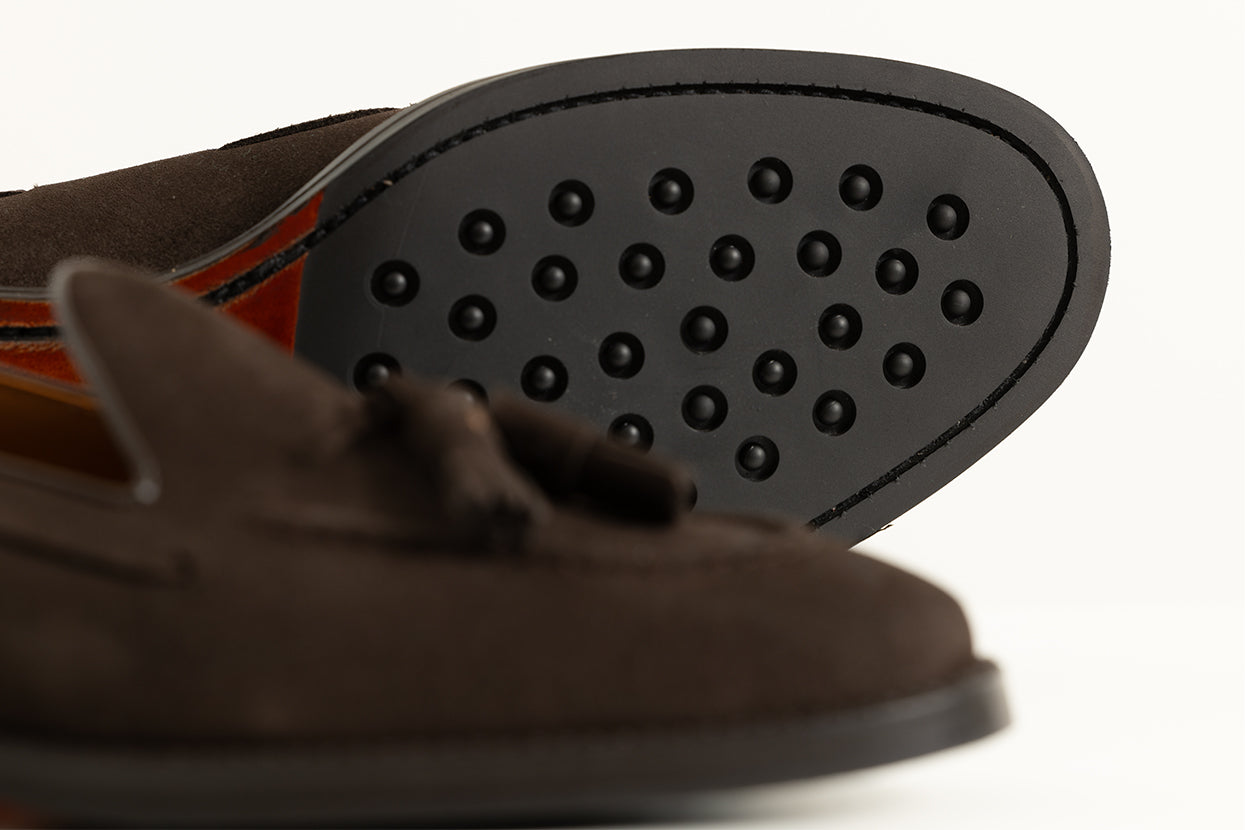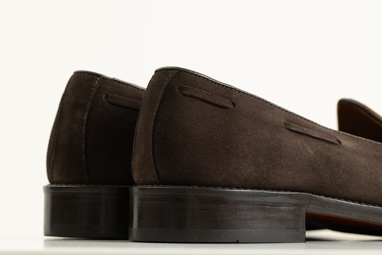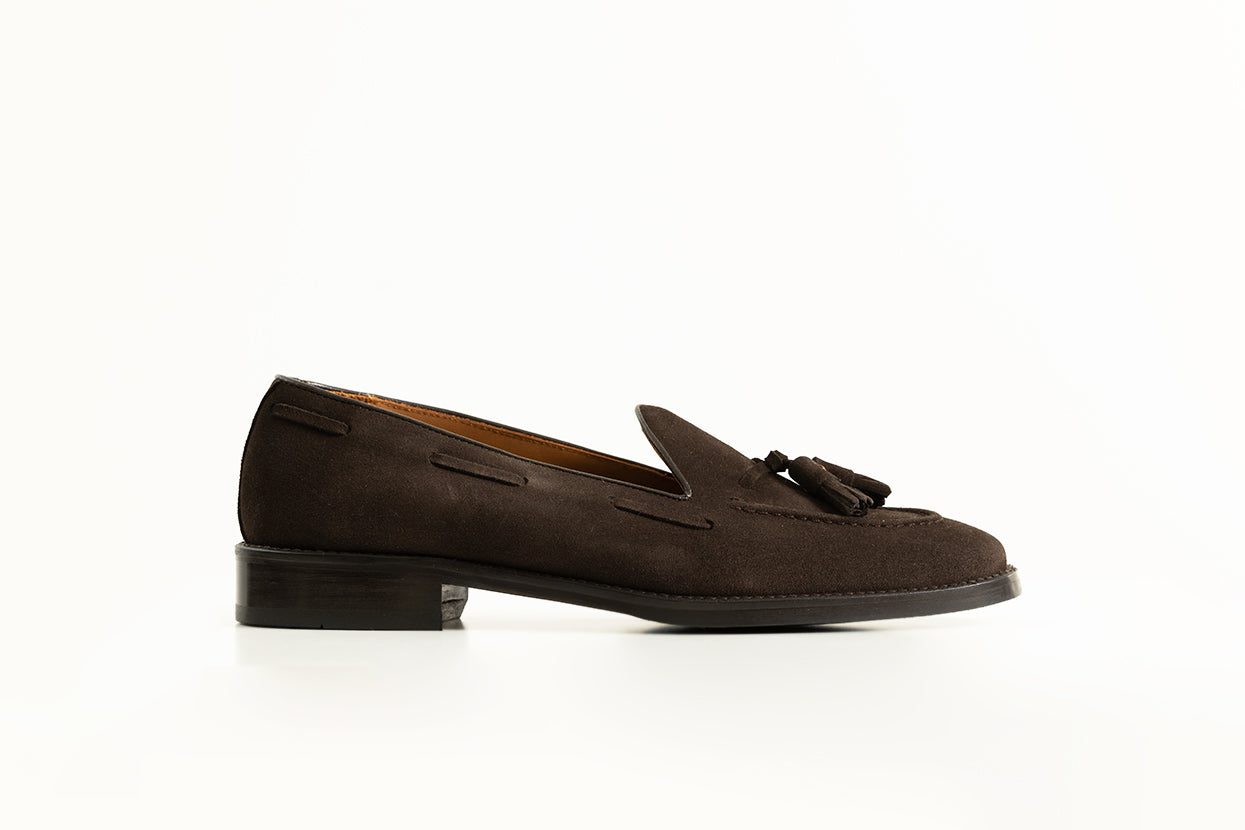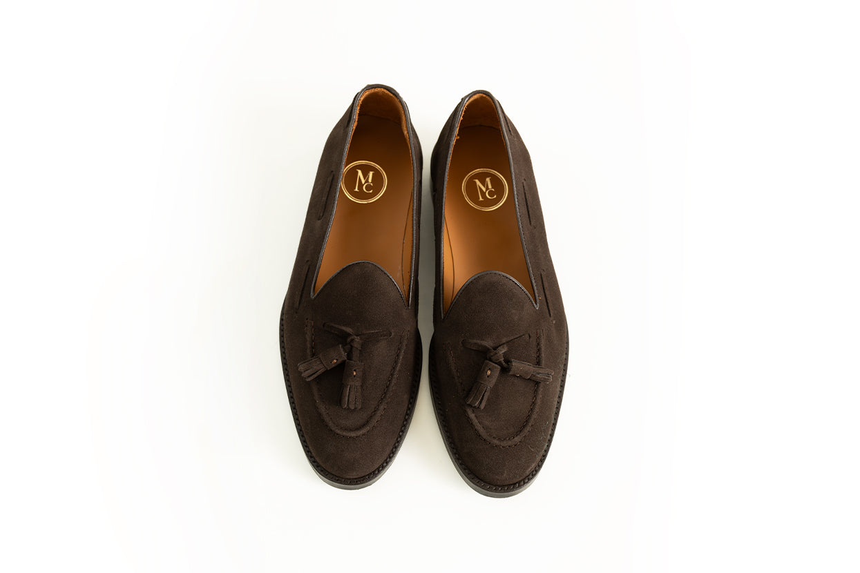 Mocasin realizado en serraje marrón oscuro, elegante y versátil. Para este modelo hemos usado una suela mixta de piel y goma, aportándole practicidad y comodidad, para ser usado a diario.
